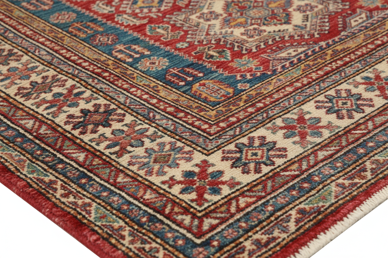 This Super Kazak Rug is a masterpiece of traditional craftsmanship, handwoven with premium natural materials. Originating from the Caucasus-inspired weaving traditions of Afghanistan, this rug reflects timeless artistry and cultural heritage.