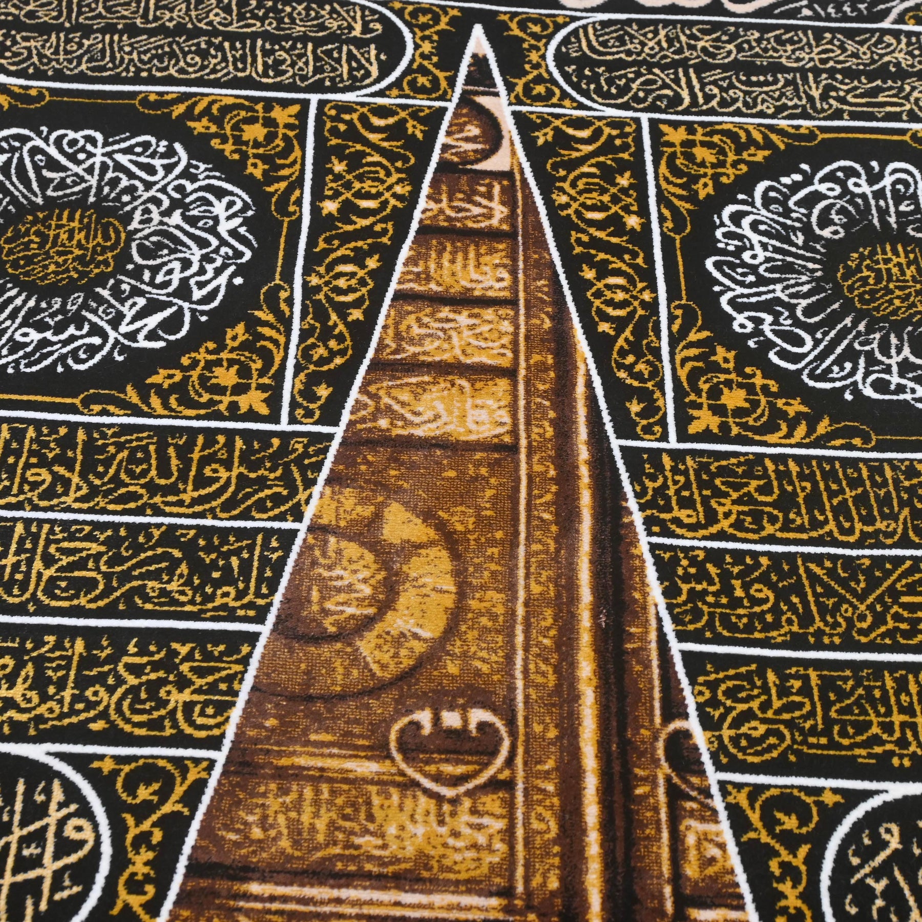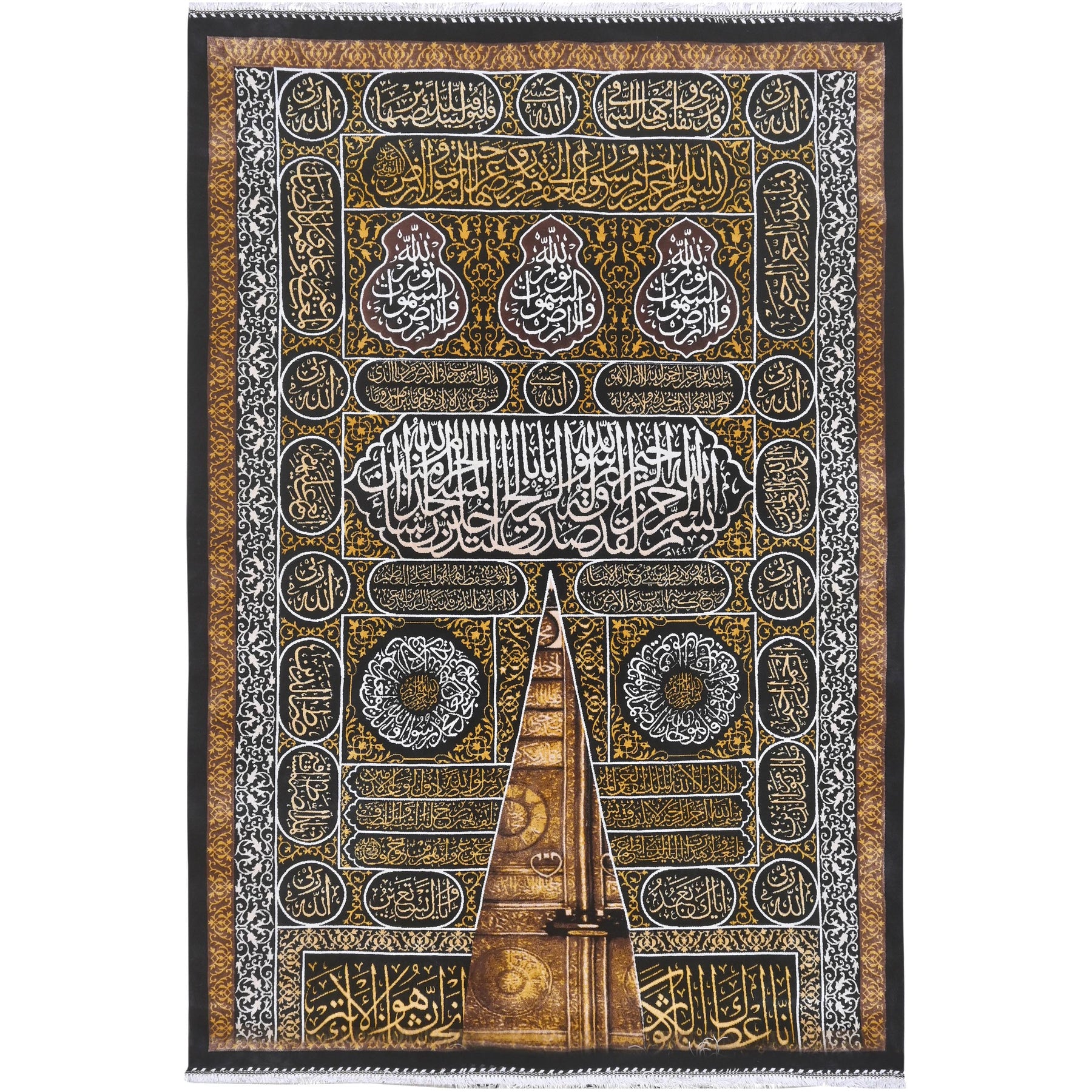 A masterpiece of Islamic artistry, this handmade Persian wall hanging depicts the sacred Door of the Kaaba (Bab al-Kaaba) in breathtaking detail, surrounded by layers of intricate Quranic calligraphy woven in gold, white, and silver threads on a deep black and antique gold ground.