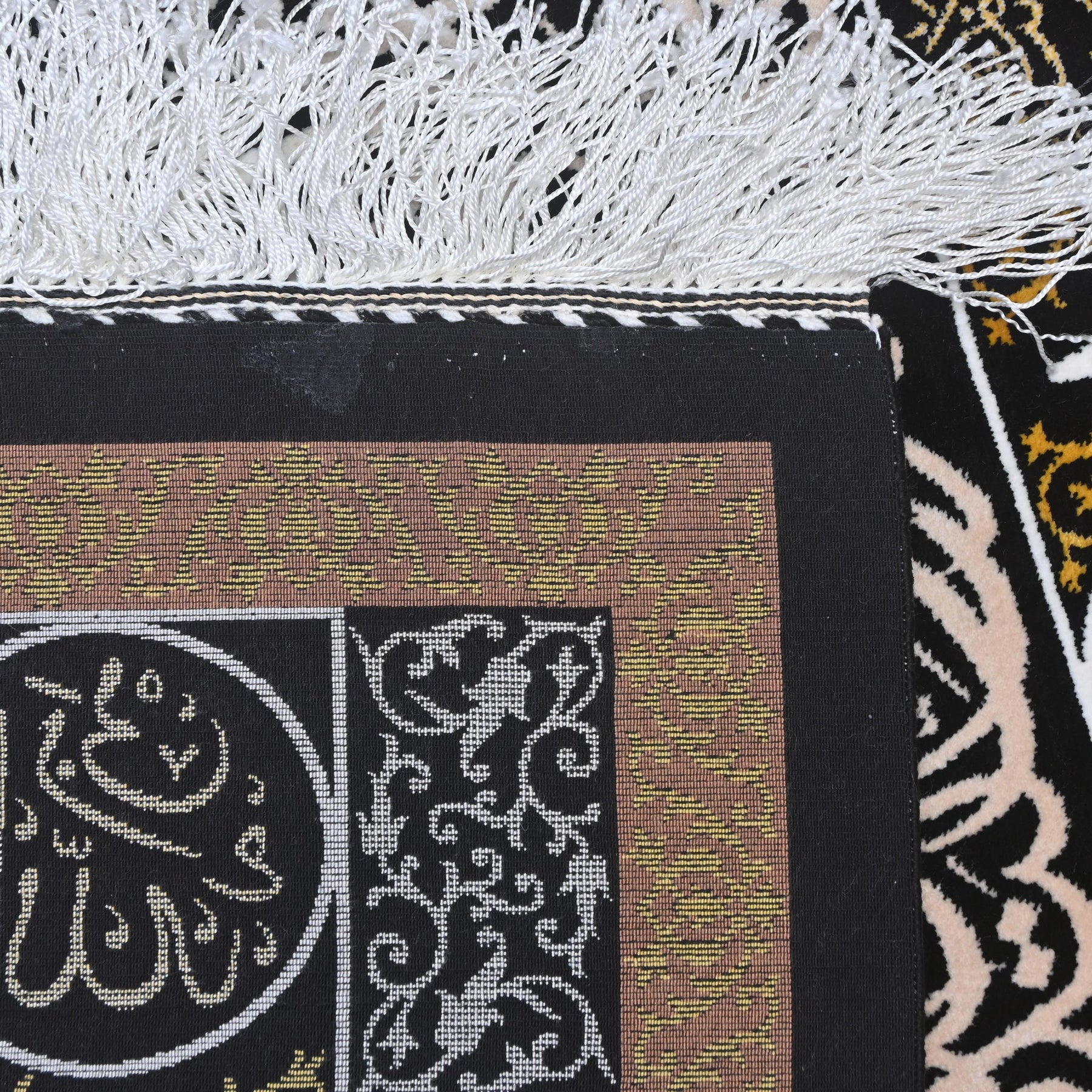 Finished with delicate hand-knotted fringe along the top and bottom, this piece carries the weight of devotion in every thread.
