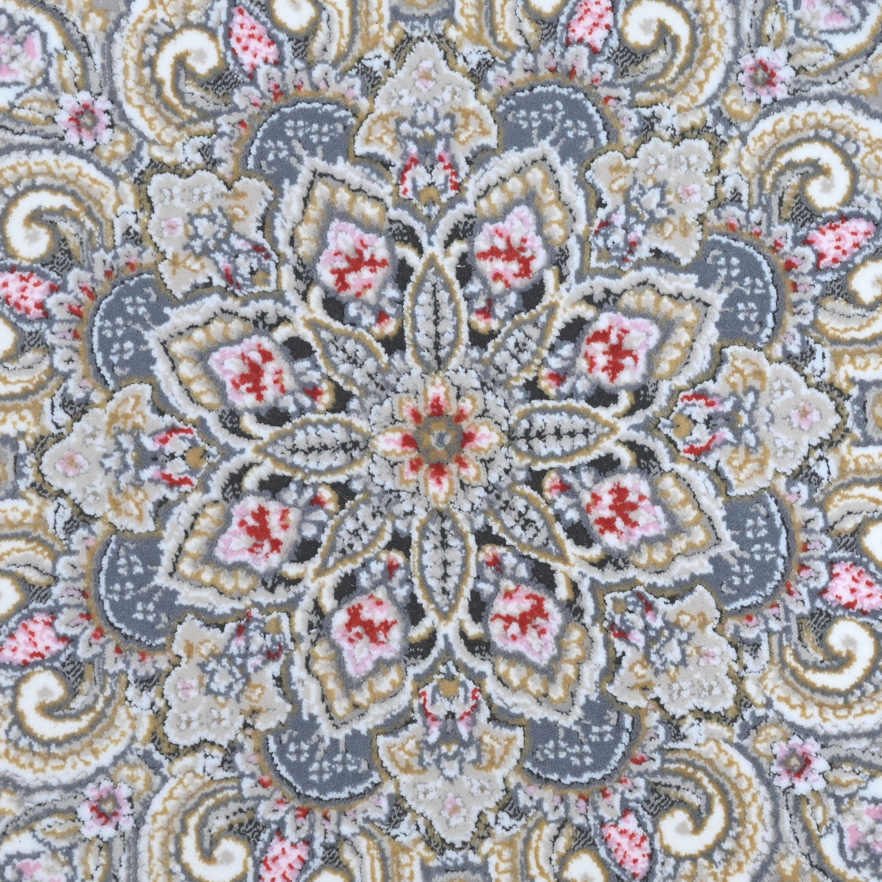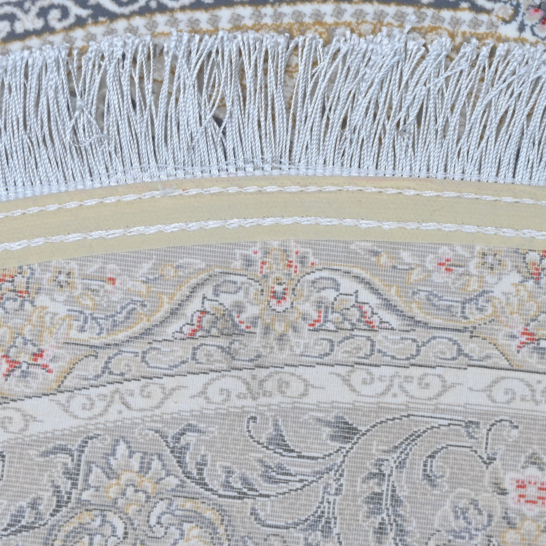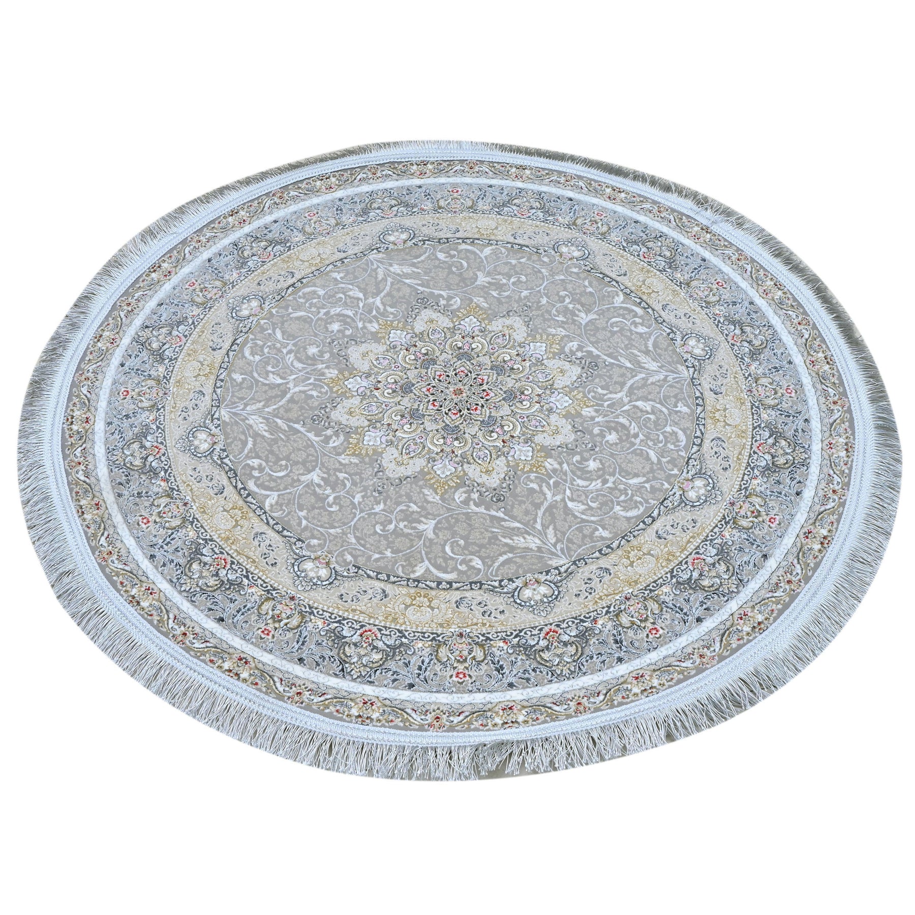 Elevate your space with this stunning round Persian rug featuring an intricate floral medallion design. The soft grey-taupe center field is adorned with delicate scrolling vines and botanical motifs, beautifully framed by light blue and black ornate borders with multicolor floral accents.