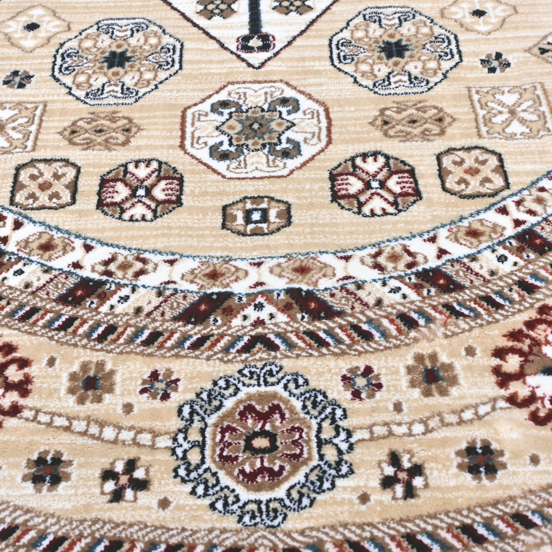 Elevate your space with this stunning round Persian rug featuring an intricate floral medallion design. The soft grey-taupe center field is adorned with delicate scrolling vines and botanical motifs, beautifully framed by light blue and black ornate borders with multicolor floral accents.