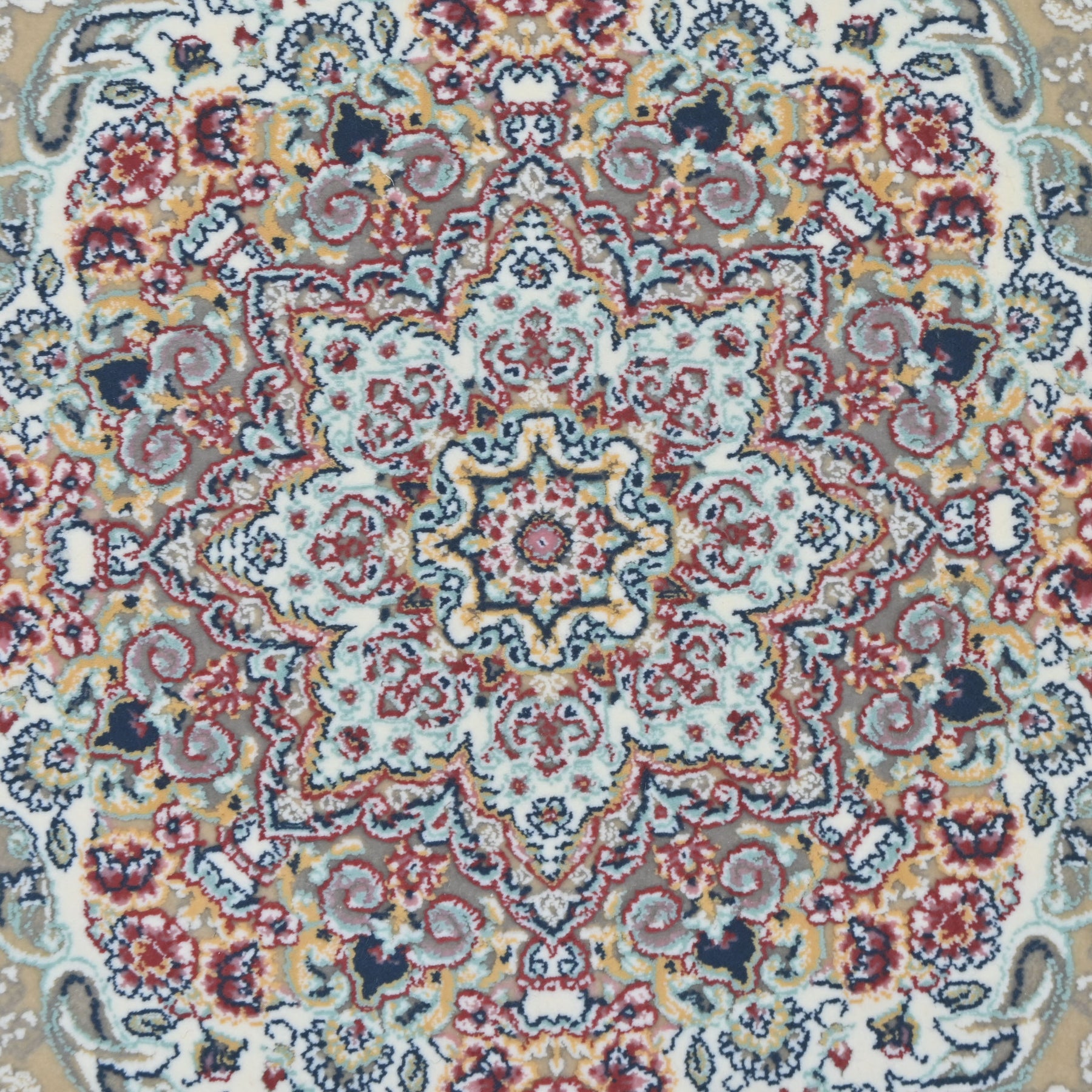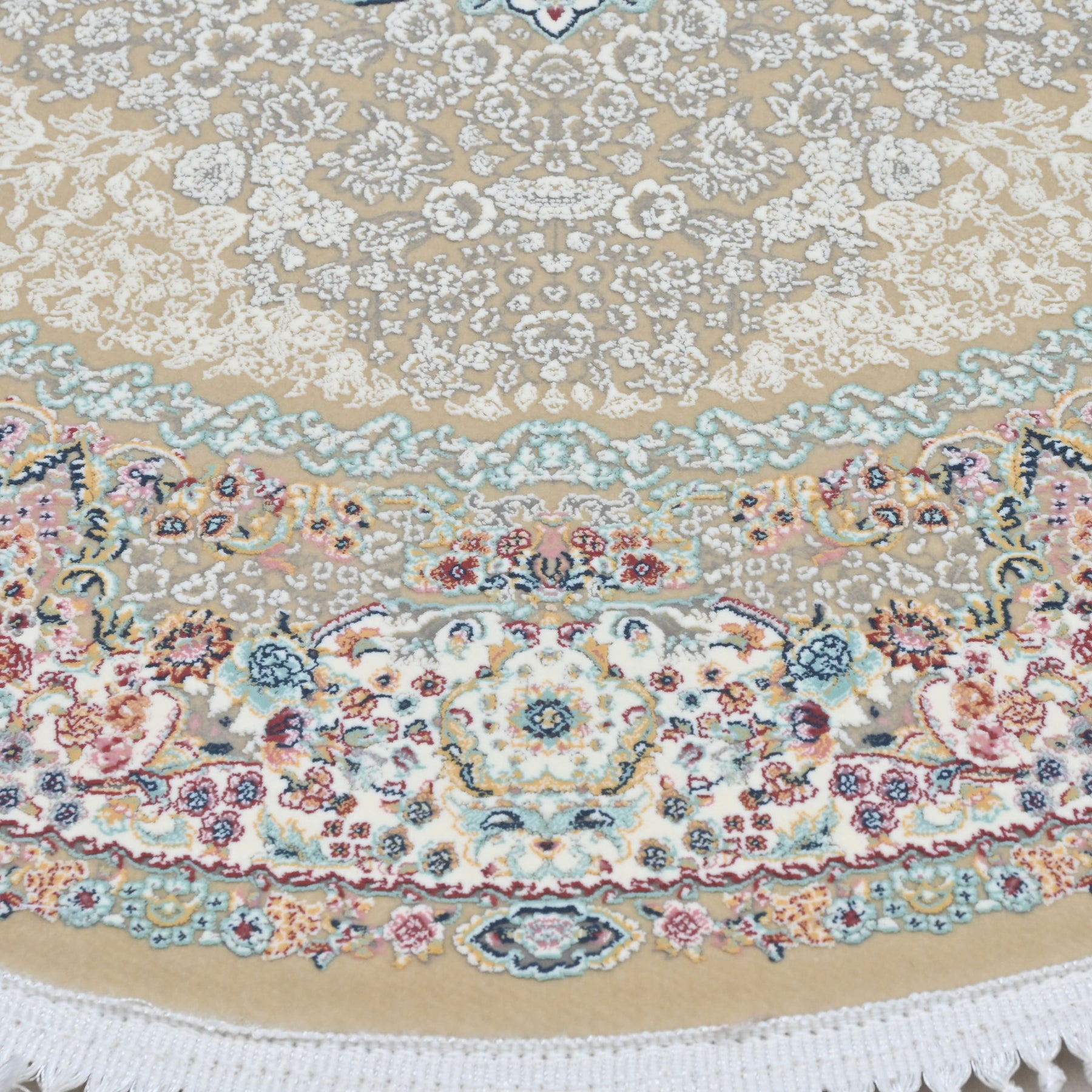 Elevate your space with this stunning round Persian rug featuring an intricate floral medallion design. The soft grey-taupe center field is adorned with delicate scrolling vines and botanical motifs, beautifully framed by light blue and black ornate borders with multicolor floral accents.