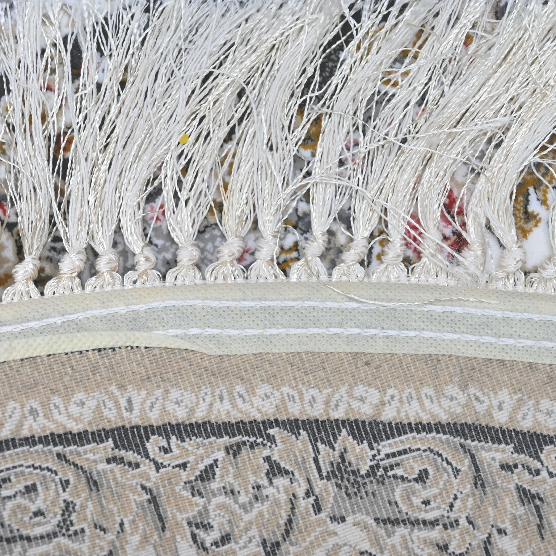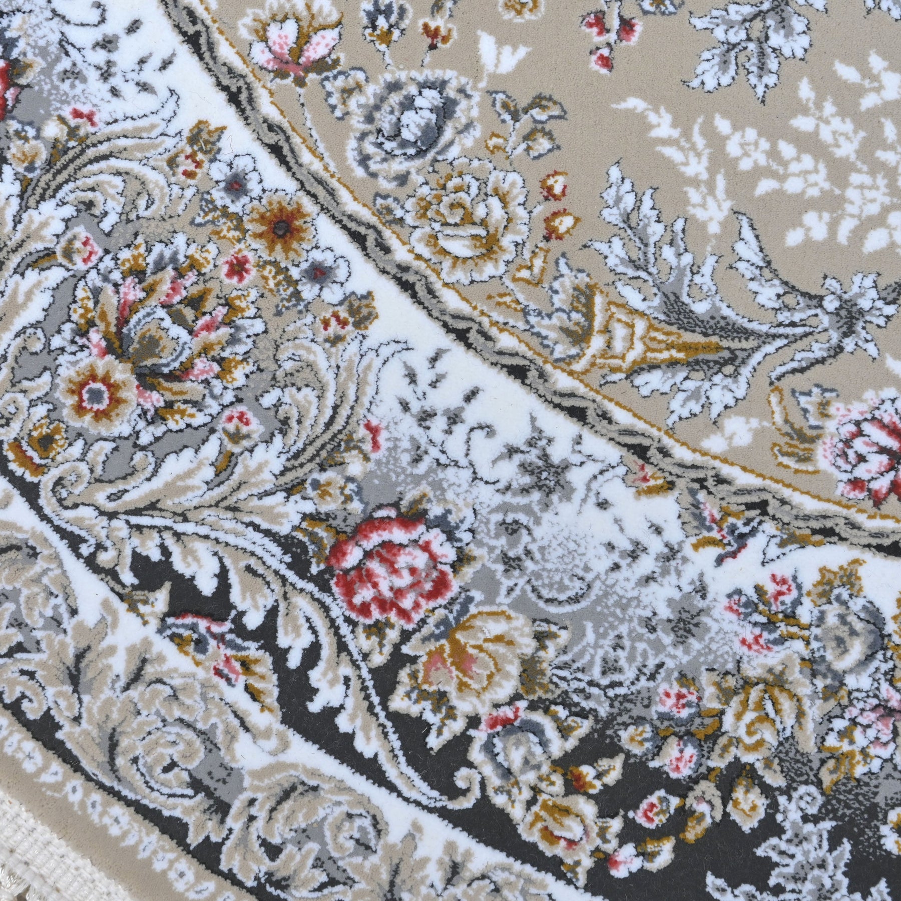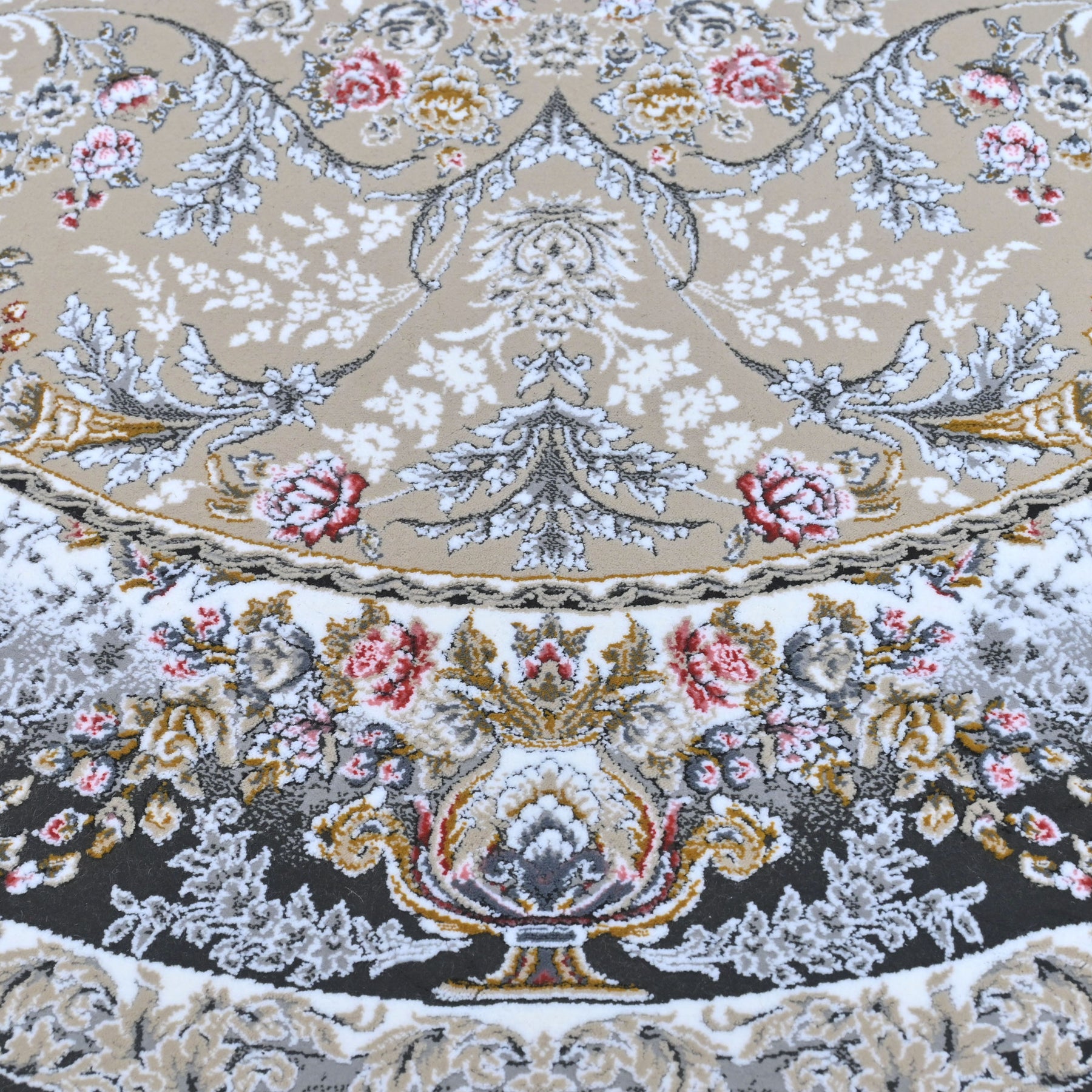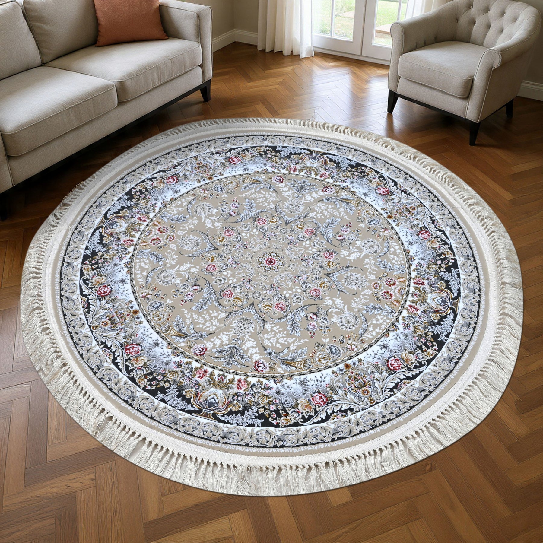 Elevate your space with this stunning round Persian rug featuring an intricate floral medallion design. The soft grey-taupe center field is adorned with delicate scrolling vines and botanical motifs, beautifully framed by light blue and black ornate borders with multicolor floral accents.